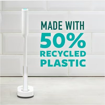 • The ergonomic handle of the Power Scour toilet cleaner wand is made from 50% recycled plastic and allows Power Scour scrub pads to reach under the rim, in the tunnel and everywhere around the bowl