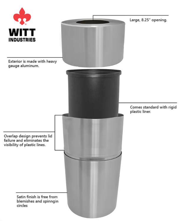 WITT Round Aluminum Indoor Waste Receptacle - 35 gallon, Aluminum Clear Coat