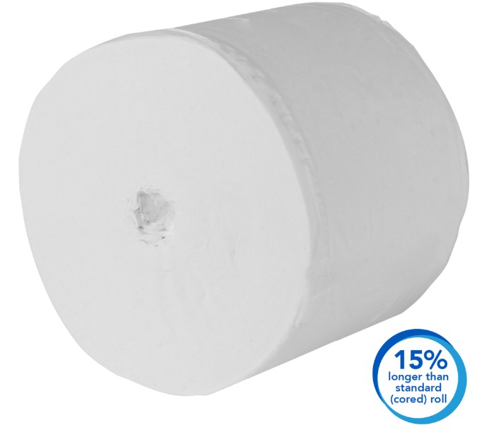 - Each bath tissue roll is nearly 15% longer than standard roll bathroom tissue, with 100% core and paper wrap elimination